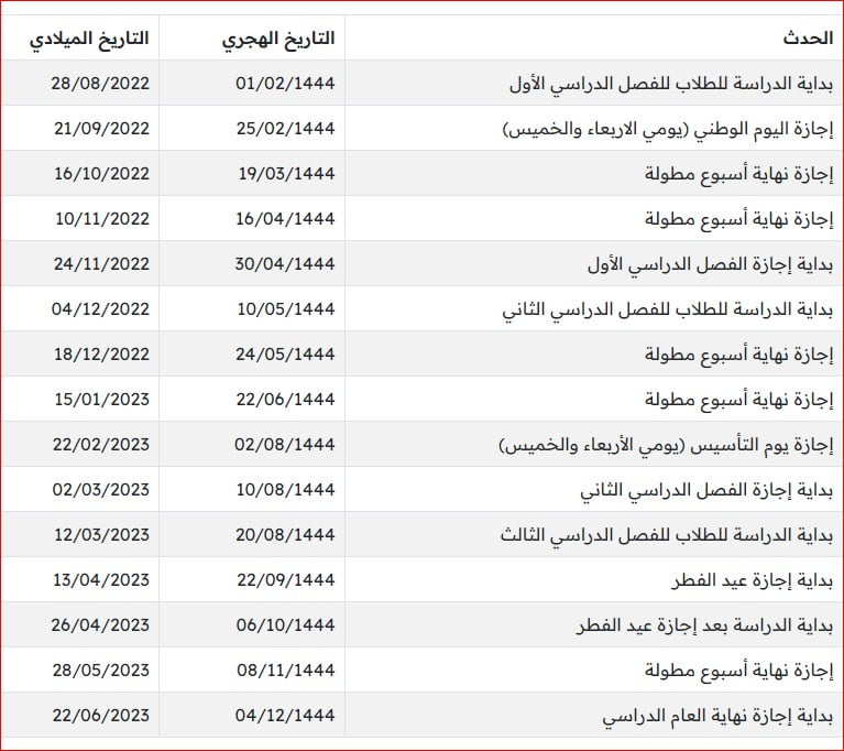 فيما يلي نستعرض التقويم الدراسي لعام 1444: