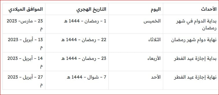 أوقات الدوام الرسمي في شهر رمضان 1444
