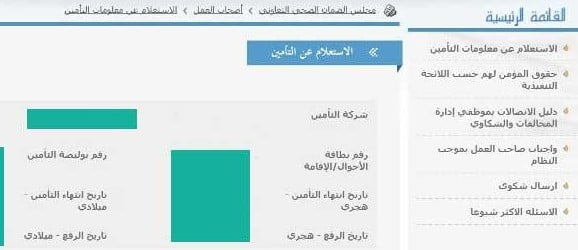 • رابعاً ستظهر لك جميع معلومات شركة التأمين الصحي مع تاريخ الصلاحية وباقي بيانات تأمينك كما في الصورة التالية.
