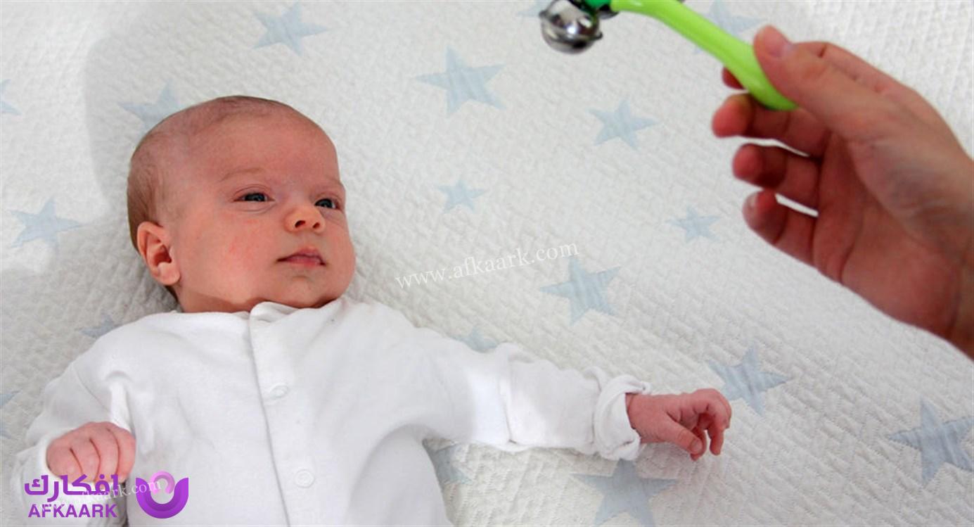 - اتبع الأشياء بالعين: يمكنك تحريك لعبة أو شيء ملون ببطء أمام عيني الرضيع ومراقبة مدى قدرته على تتبع الحركة بعينيه.